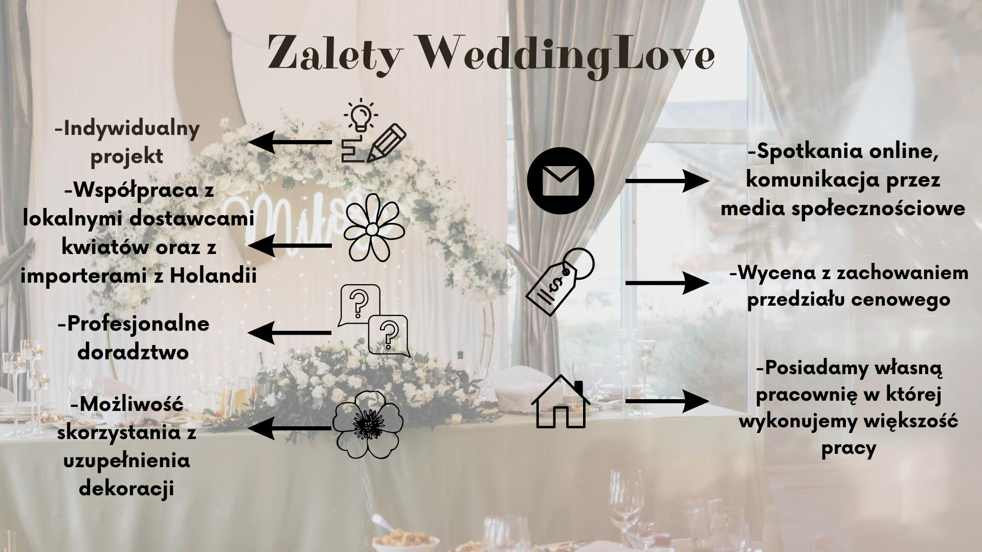 DOSKONAŁA Na podstawie 49 opinii Iva Kolasa2023-10-21polecaTrustindex sprawdza, czy pierwotnym źródłem recenzji jest Facebook. Serdecznie polecamy firmę WeddingLove! Bardzo rzetelna i konkretna współpraca, wszytko dopięte na ostatni guzik, byłam pod ogromnym wrażeniem dekoracji zarówno sali, kościoła, przygotowanie bukietu, przystrojenia domu i auta. Pełna profeska, super kontakt i dużo dobrej energii😊 Karolina Borkowska2023-09-13polecaTrustindex sprawdza, czy pierwotnym źródłem recenzji jest Facebook. Ponad rok później, ale niektóre opinie lepiej wystawiać później niż wcale, bo dobre firmy trzeba głośno chwalić - z całego serca polecam usługi od Państwa z WeddingLove - przesympatyczny i sprawny kontakt, klarowna umowa, genialna realizacja, w gratisie ratowanie nieco uszkodzonego neonu, który wypożyczyła inna firma i katastrofa przedślubna była bliska - na szczęście zażegnana dzięki sprawnym akcjom 🤍 Jeszcze raz bardzo dziękuję za przepiękną ściankę! 🕊️ Wspominam ją do dzisiaj patrząc na zdjęcia 😇 Agata Talaga2023-08-06polecaTrustindex sprawdza, czy pierwotnym źródłem recenzji jest Facebook. Z całego serca mogę polecić współpracę z WeddingLove. Super profesjonalne podejście, miła i konkretna współpraca, a same dekoracje wyszły przecudnie ♥️ Wszystkie marzenia zostały spełnione! Natalia Kaźmierczak2023-06-29polecaTrustindex sprawdza, czy pierwotnym źródłem recenzji jest Facebook. Z czystym sumieniem polecam! Wszystkie dekoracje oraz mój bukiet, korsarz i butonierki były przepiękne ❤️ Od początku kontakt z WeedingLove był na bardzo wysokim poziomie. Pan Mateusz to przesympatyczna osoba, która potrafi słuchać, ale i także doradzić. Jeszcze raz bardzo dziękujemy 😊 Klaudia Ustarbowska-Kuchniak2023-06-18polecaTrustindex sprawdza, czy pierwotnym źródłem recenzji jest Facebook. Nasze dekoracje nie były prostym wyzwaniem - natomiast dla Mateusza i jego ekipy z firmy wedding love nie ma rzeczy niemożliwych. Bardzo dziękujemy, za piękne dekoracje kwiatowe, wspaniałe dodatki - dzięki Wam, nasze wesele było wyjątkowe. Oprócz tego - ogromny profesjonalizm, wiedza dotycząca kwiatów, wspaniały gust. Polecamy BARDZO. Dziękujemy 💜. Sylwia Harris2023-06-05polecaTrustindex sprawdza, czy pierwotnym źródłem recenzji jest Facebook. Dziękujemy za cudowną ściankę i dekoracje ślubne! Połączenia kolorów były cudowne i niezwykle prezentowały się na sali weselnej! Polecamy z całego serca. Kontakt z Mateuszem był bardzo dobry, odpowiadał na wszystkie pytania (a trochę ich było) i zawsze służył pomocą. Pełen profesjonalizm. 😊 Paulina Szkobel2022-09-27polecaTrustindex sprawdza, czy pierwotnym źródłem recenzji jest Facebook. Zdecydowanie polecam! Bukiety na stoły, ścianka i pozostałe dekoracje przepiękne :) Izabela Stasiak2022-09-27polecaTrustindex sprawdza, czy pierwotnym źródłem recenzji jest Facebook. Dekoracje wykonane przepięknie i staranie . Nasz stół ubrany był dokładnie tak jak tego chcieliśmy . Kontakt z firma na najwyższym poziomie . Polecamy wszystkim. Emilia Ołowska2022-09-15polecaTrustindex sprawdza, czy pierwotnym źródłem recenzji jest Facebook. WeddingLove przygotował dla nas przepiękną ściankę na sali weselnej na Czarnym Stawie. Idealnie dobrane kwiaty i porządne wykonanie. Na pochwałę zasługuje też bardzo dobry kontakt z firmą. Serdecznie polecam! Ola Walczak2022-08-30polecaTrustindex sprawdza, czy pierwotnym źródłem recenzji jest Facebook. Bardzo polecam! Ścianka przepiękna, reszta dekoracji również. 😍