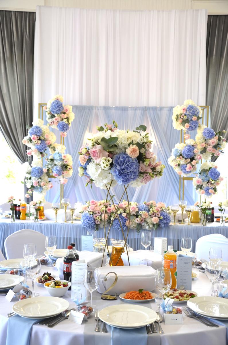 – Uzupełnienie dekoracji stołów gośći w niskie kompozycje kwiatowe, dodatkowe kwiaty, świeczniki świeczki, numerki na stoły, materiały, podtalerze.